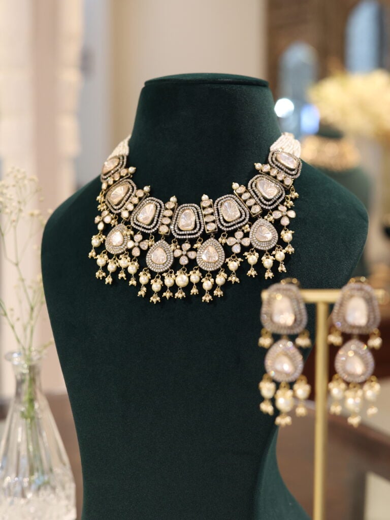 A Polki necklace features uncut diamonds set in gold. It’s known for its royal and antique feel. These pieces are often chosen as part of Polki bridal jewellery for weddings and grand functions. The raw sparkle of the stones gives a soft, old-world glow that pairs beautifully with traditional Indian attire.