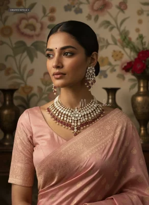Pink sarees pair beautifully with a range of jewellery materials. Some popular options include:
