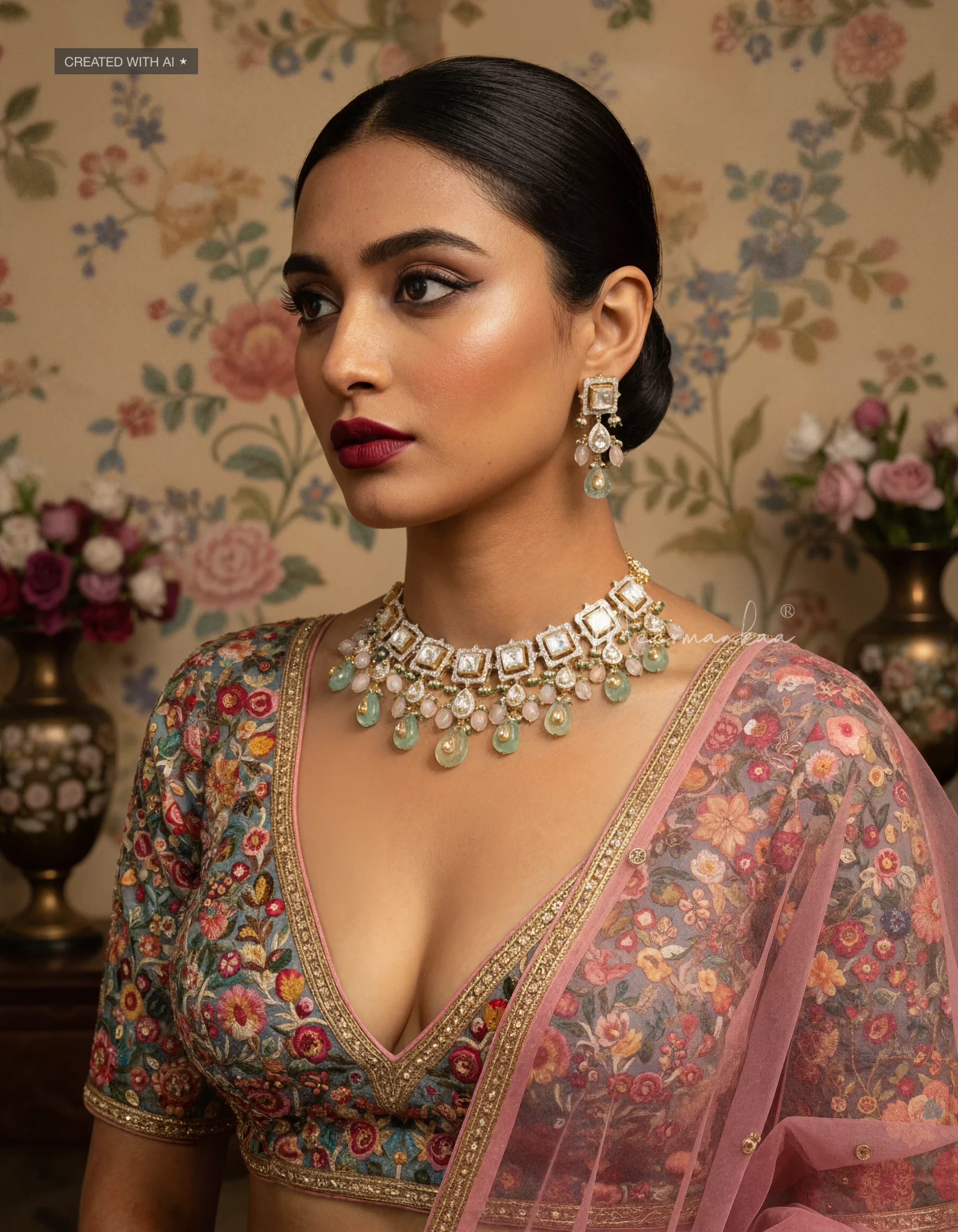 A stunning and statement piece perfect for any occasion. The set is studded with Moissanite polkis followed by pastel colored drops comes with a pair of beautiful earrings.