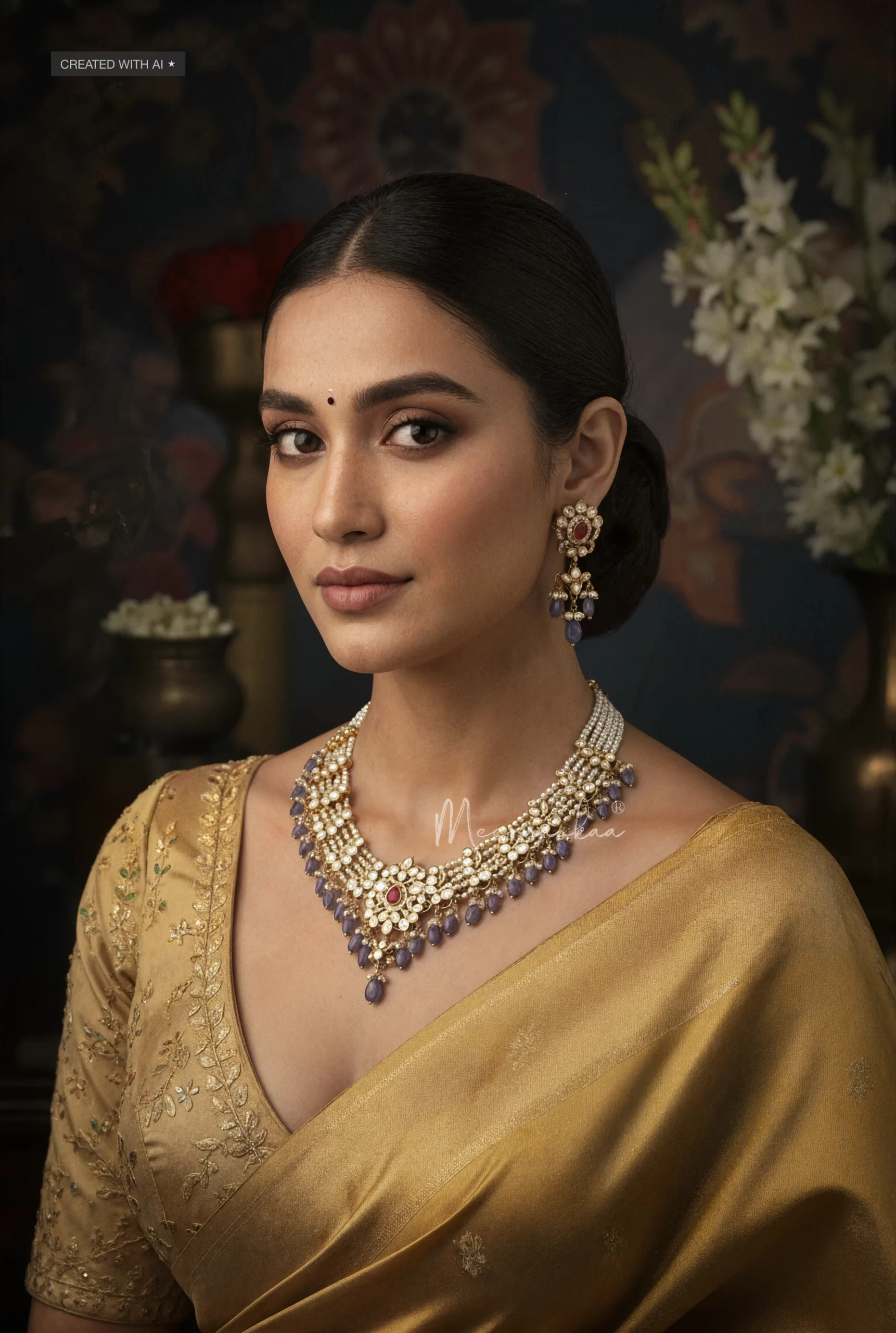 This set is ideal for party wear and can be beautifully paired with lehengas, sarees, or suits for a glamorous look.