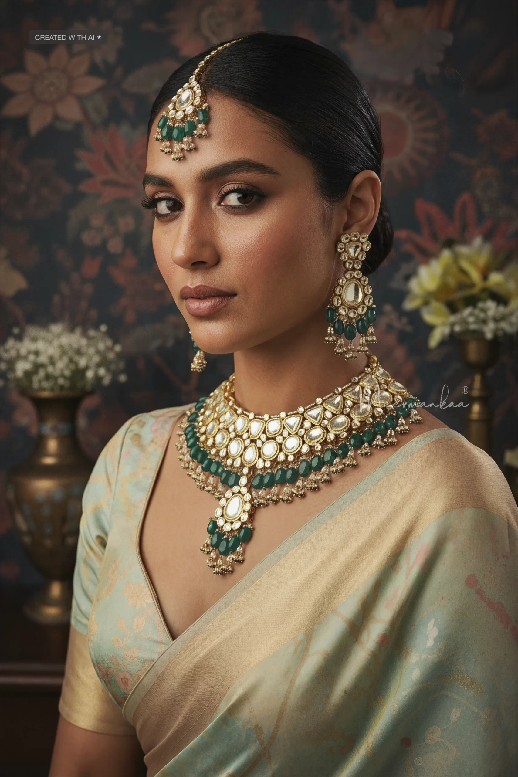 The Necklace comes with a pair of statement long earrings and a Mangtikka.