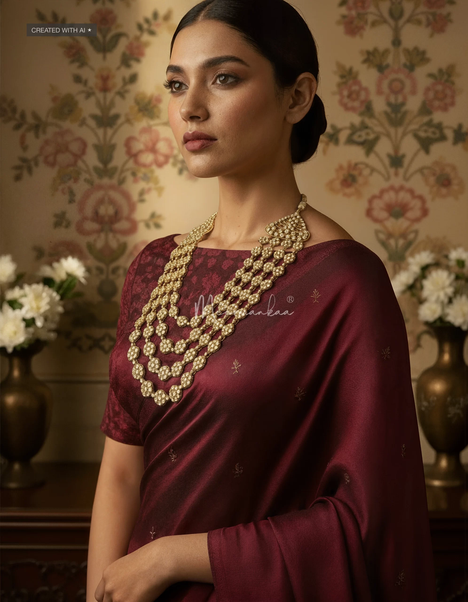 Gold plated and encrusted with artificial polkis, this necklace can be layered beautifully under your wedding set or worn independently for a statemet traditional look.