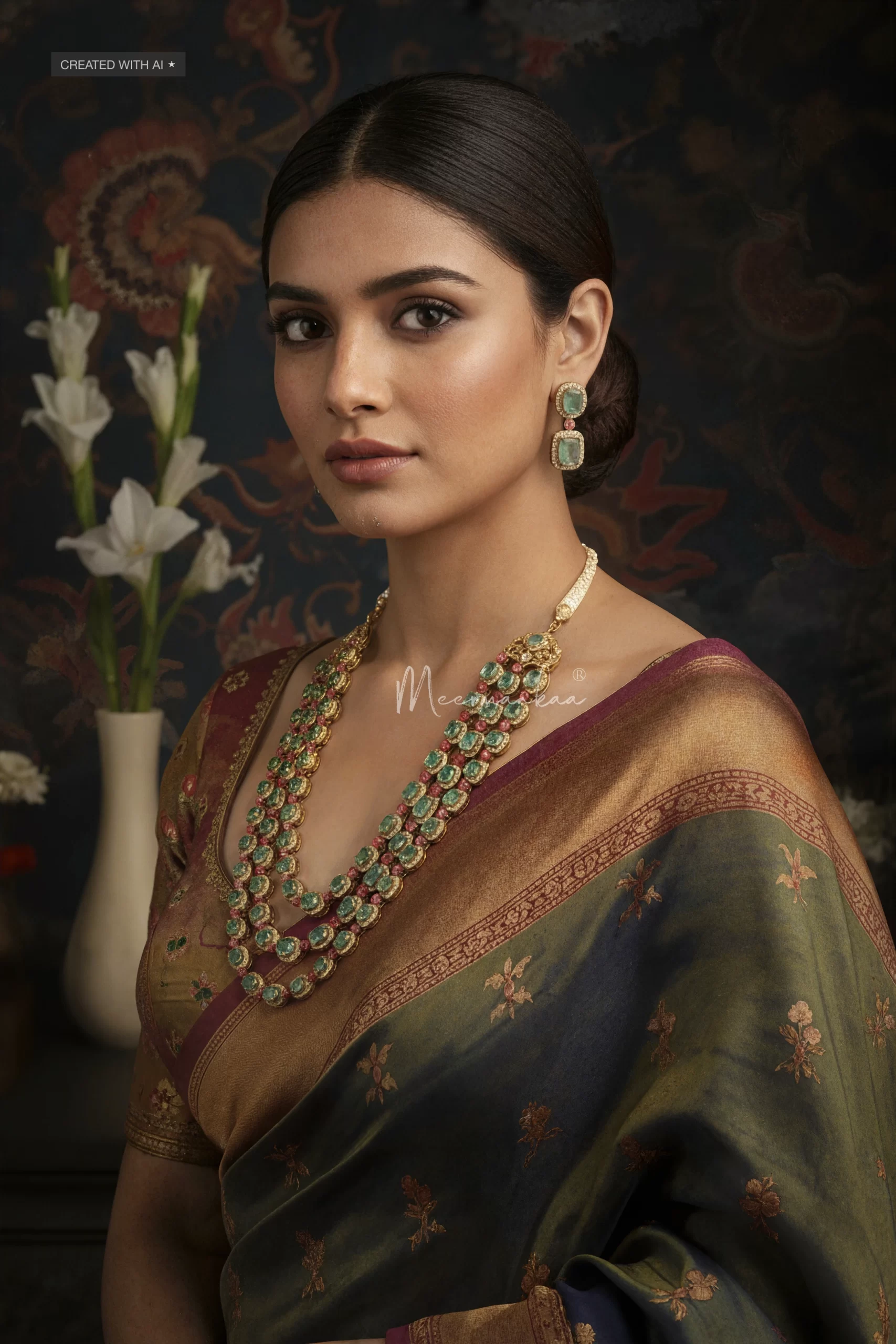 The Itr Three Layered Set is a majestic statement piece, handcrafted in sterling silver and plated in 22kt 1-micron antique gold. The necklace is designed in an elegant three-layered format that feels both opulent and refined.