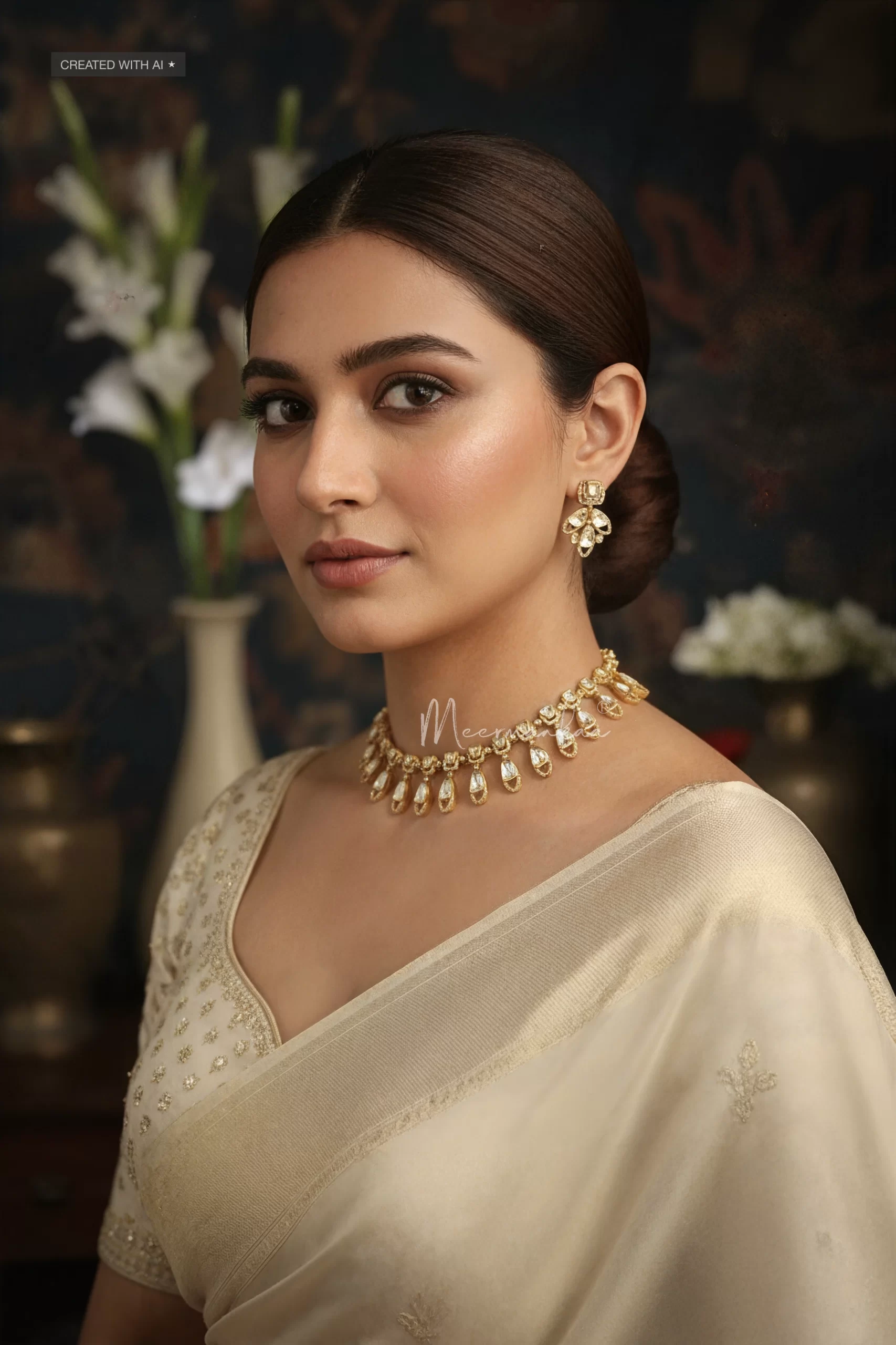 The Keyara Necklace Set exudes contemporary elegance while embracing traditional sensibilities. Crafted in a dull gold-plated alloy, this sleek choker is set with artificial polkis in an open setting, offering a refined, airy aesthetic. The design is further accentuated with delicate zirconia accents, lending a soft shimmer that enhances the brilliance of each stone.