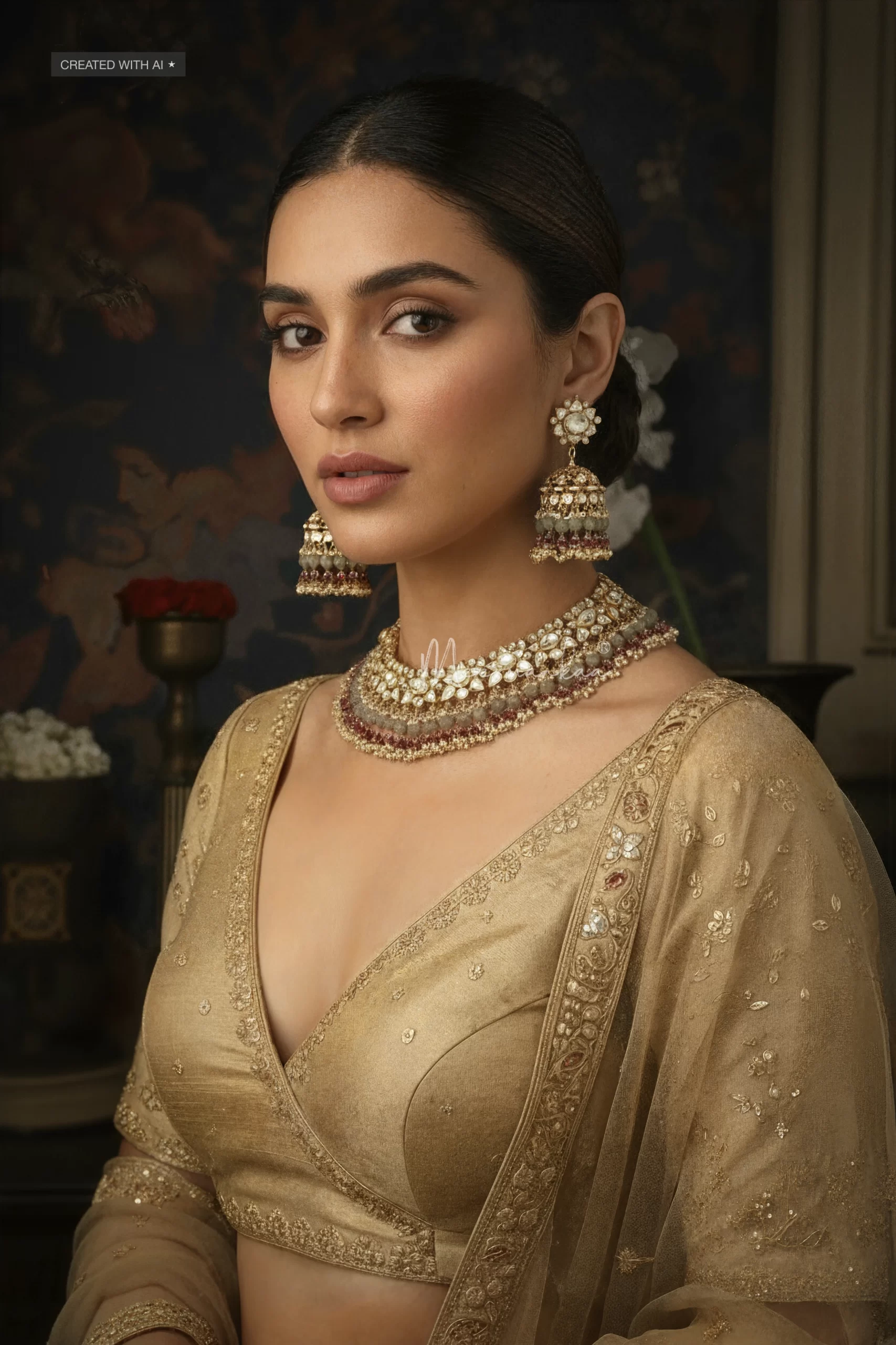 The Lakshmika Necklace Set is an elegant composition of traditional elements and soft, graceful hues. The necklace features a band of floral motifs set with artificial polki stones, arranged in a rhythmic pattern that gracefully encircles the neckline. Below, a meticulously strung piroyi of pearls, pastel green semi-precious beads, and ruby-colored accents creates a beautiful layered fringe that moves delicately with every gesture.