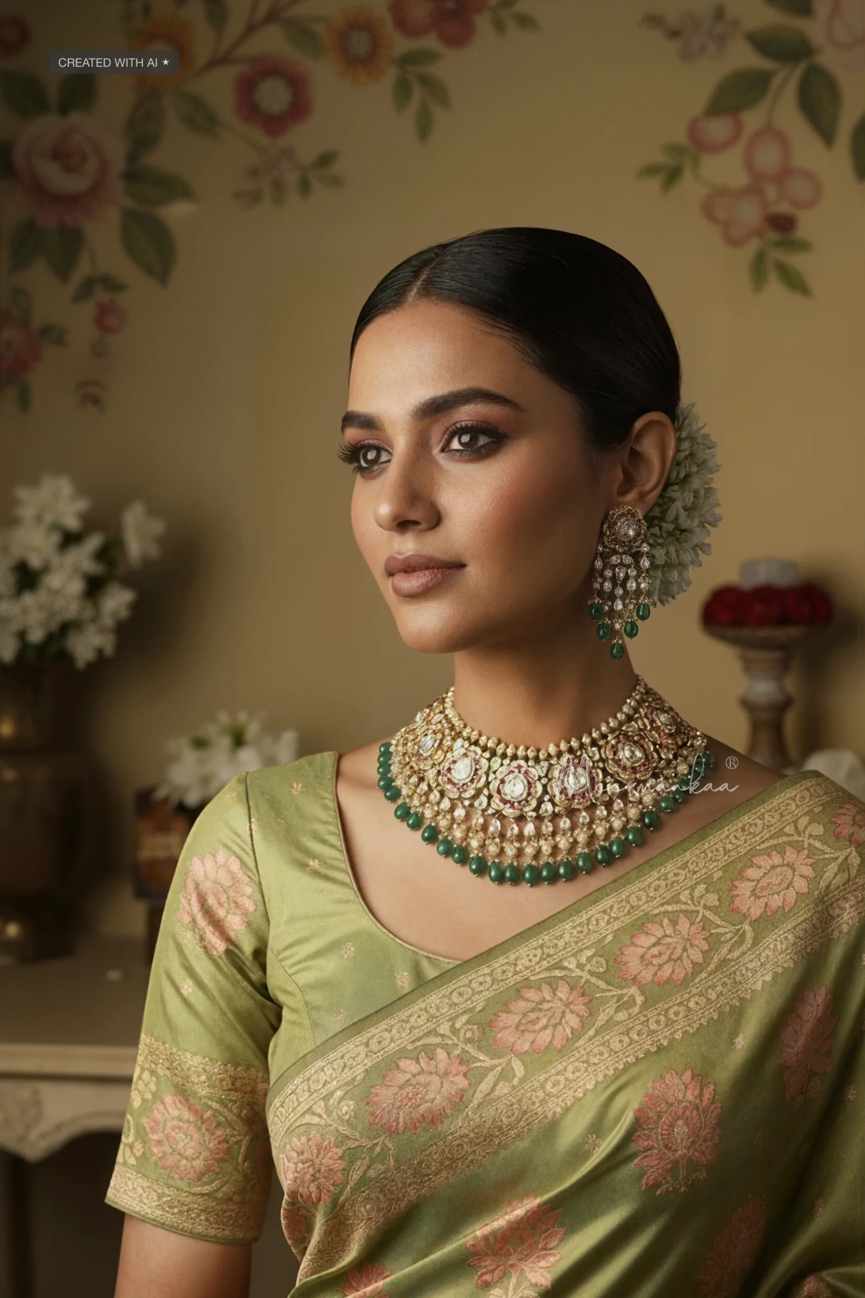 Each floral motif has moissanite polki petals with a small flower set in pastel pink faceted stones, followed by a big uncut moissanite polki centre stone.