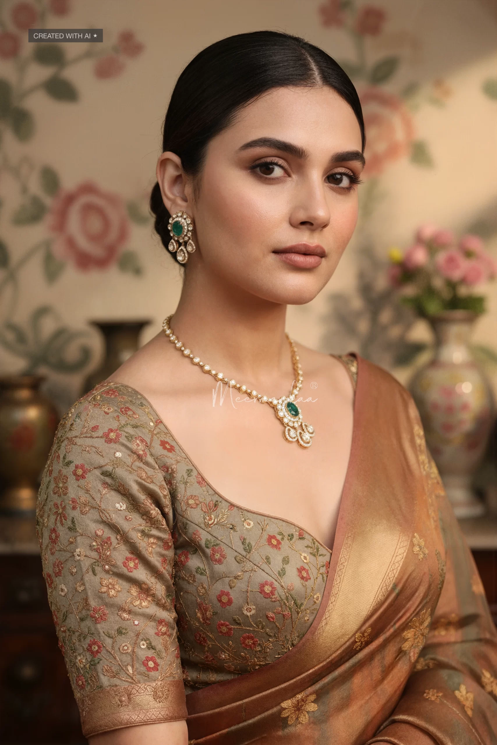 Strung in Moissanite polki chain with a pendant finished with pear drops. The Emerald color green stone in the centre adds the perfect pop of color to the design.