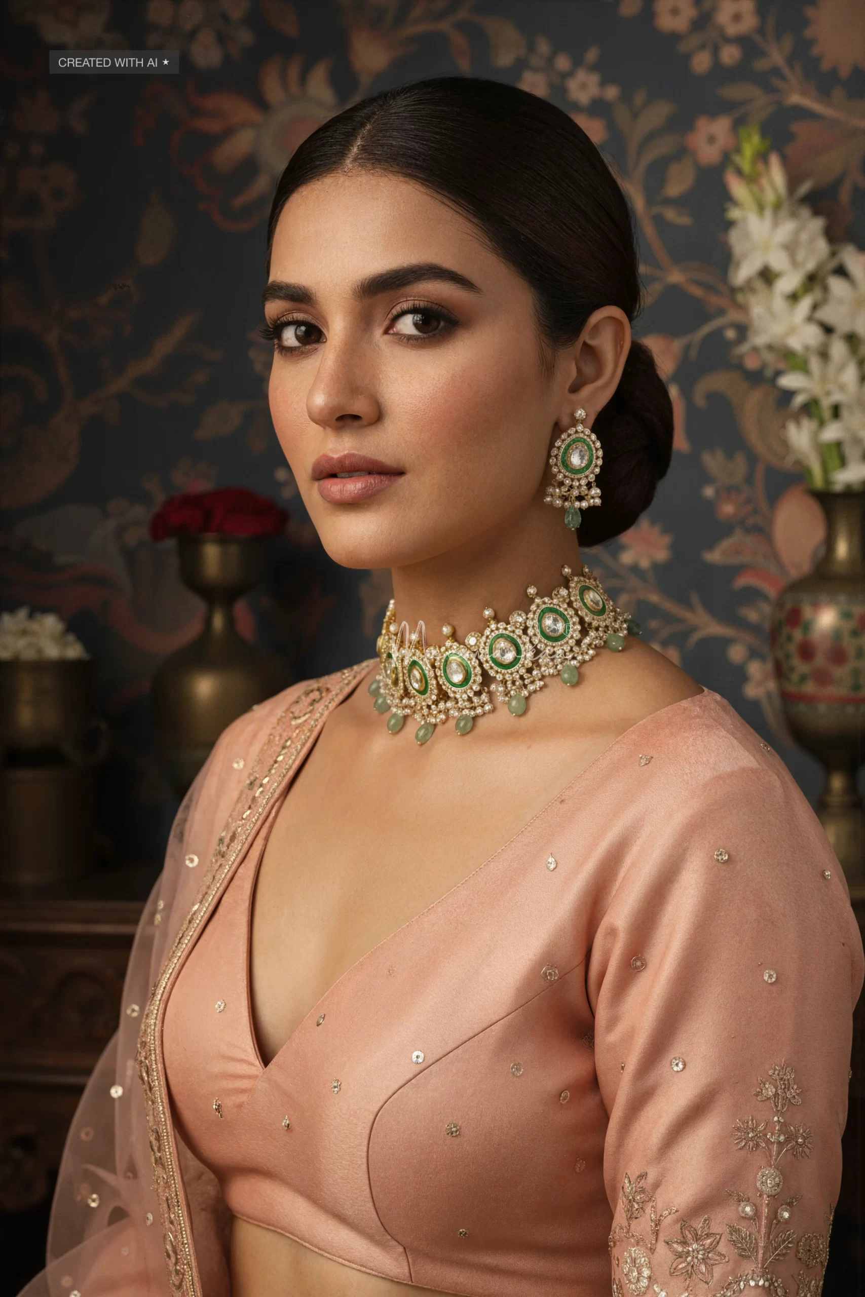 The upper edge of the choker is embellished with pearls that protrude delicately, adding a touch of sophistication. Complementing the choker, the matching drop earrings follow the same intricate pattern, featuring moissanite polkis and green enamel work. These earrings are designed with omega clips and screws for a secure fit.