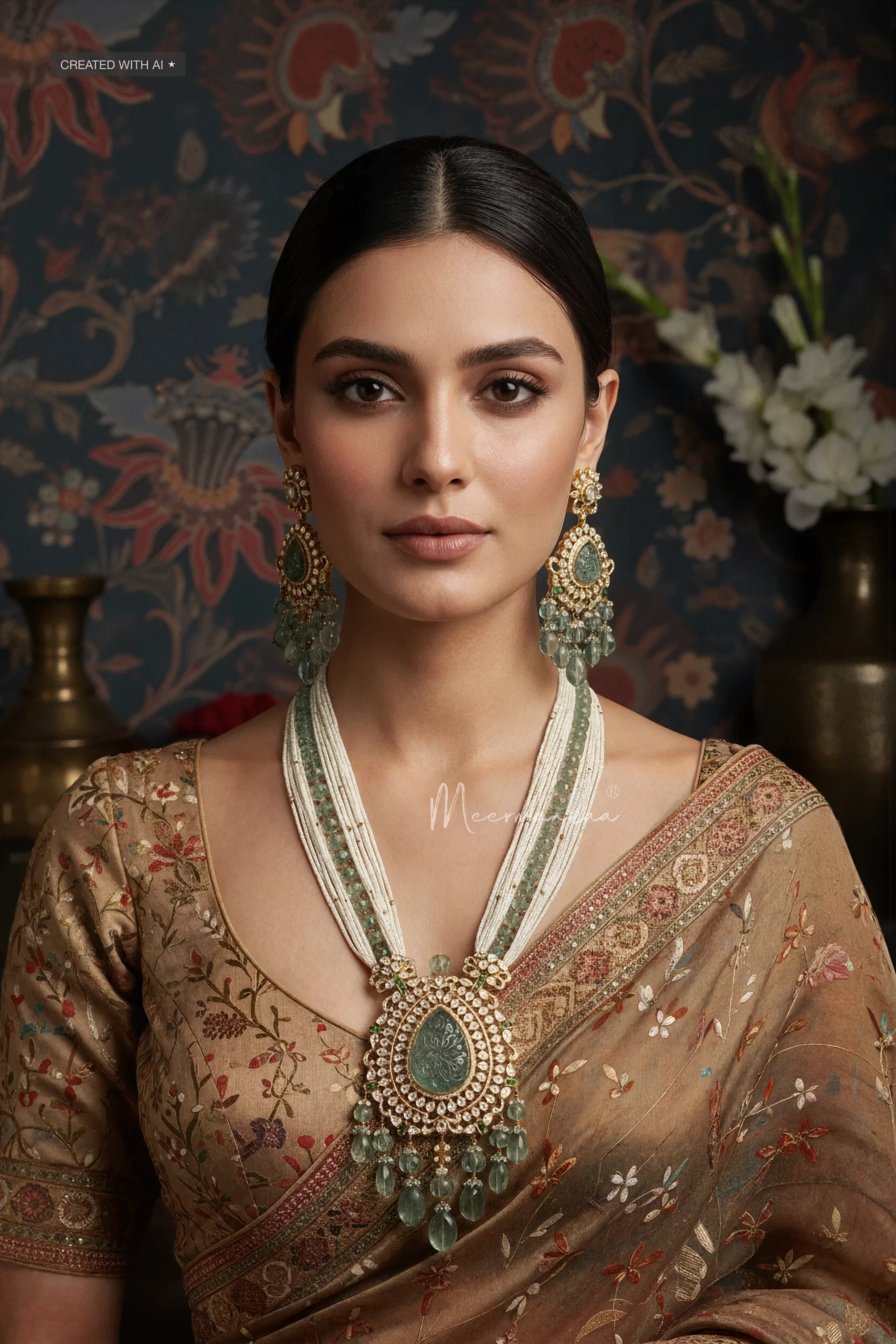 Introducing a floral long pendant Necklace, a masterpiece of elegance and beauty. Crafted in sterling silver with shimmering moissanite polki, it features a captivating pastel green carved flourite stone at its center. Delicately strung with lines of pearls and flourite beads, this necklace radiates grace and sophistication.