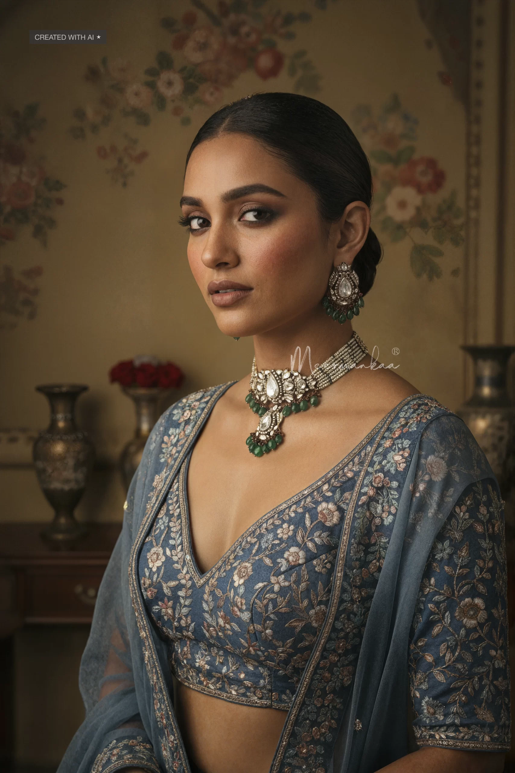 A delicately designed choker necklace with stud earrings, in Sterling Silver with moissanite plating and zirconia crystals.
