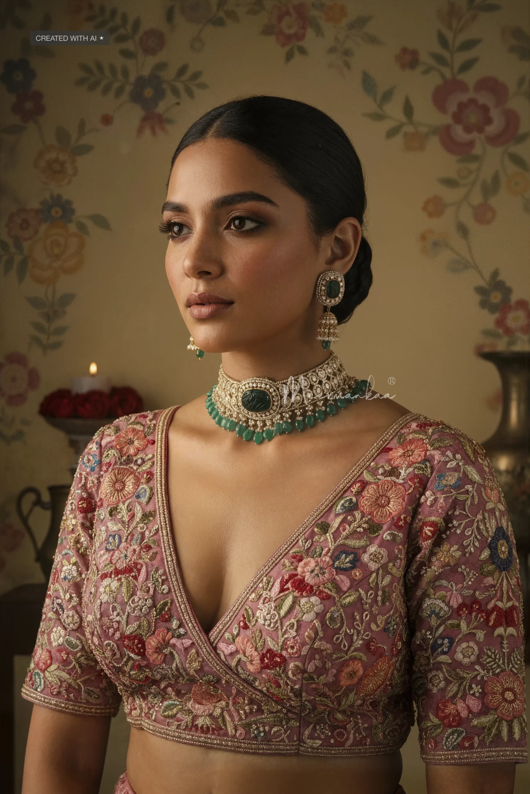 This gorgeous Sterling Silver Choker set is studded with Moissanite polkis and Zirconia crystals.