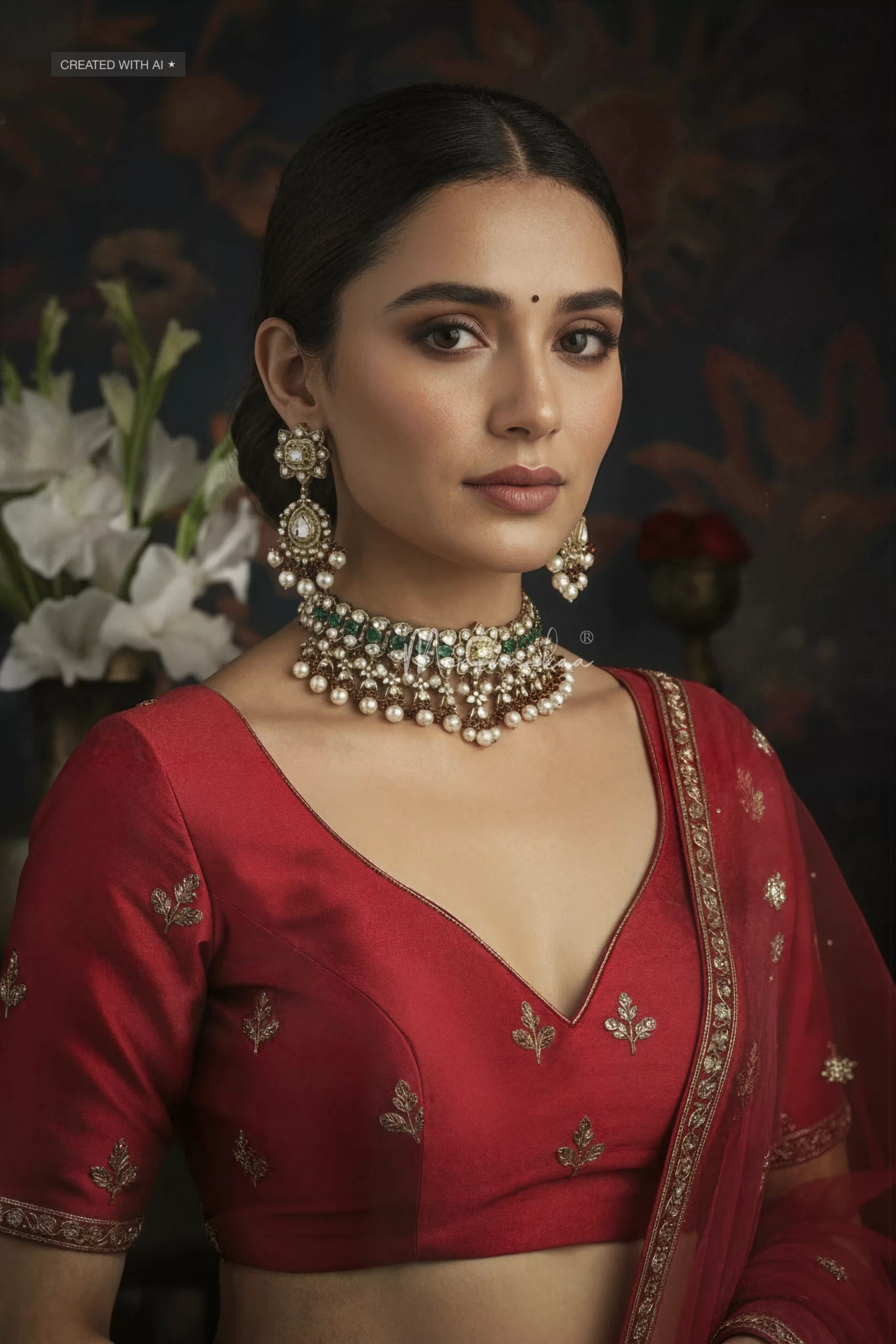 Perfect for brides, this red, green, and pearl masterpiece beautifully complements traditional attire, making it an ideal choice for weddings and grand celebrations.