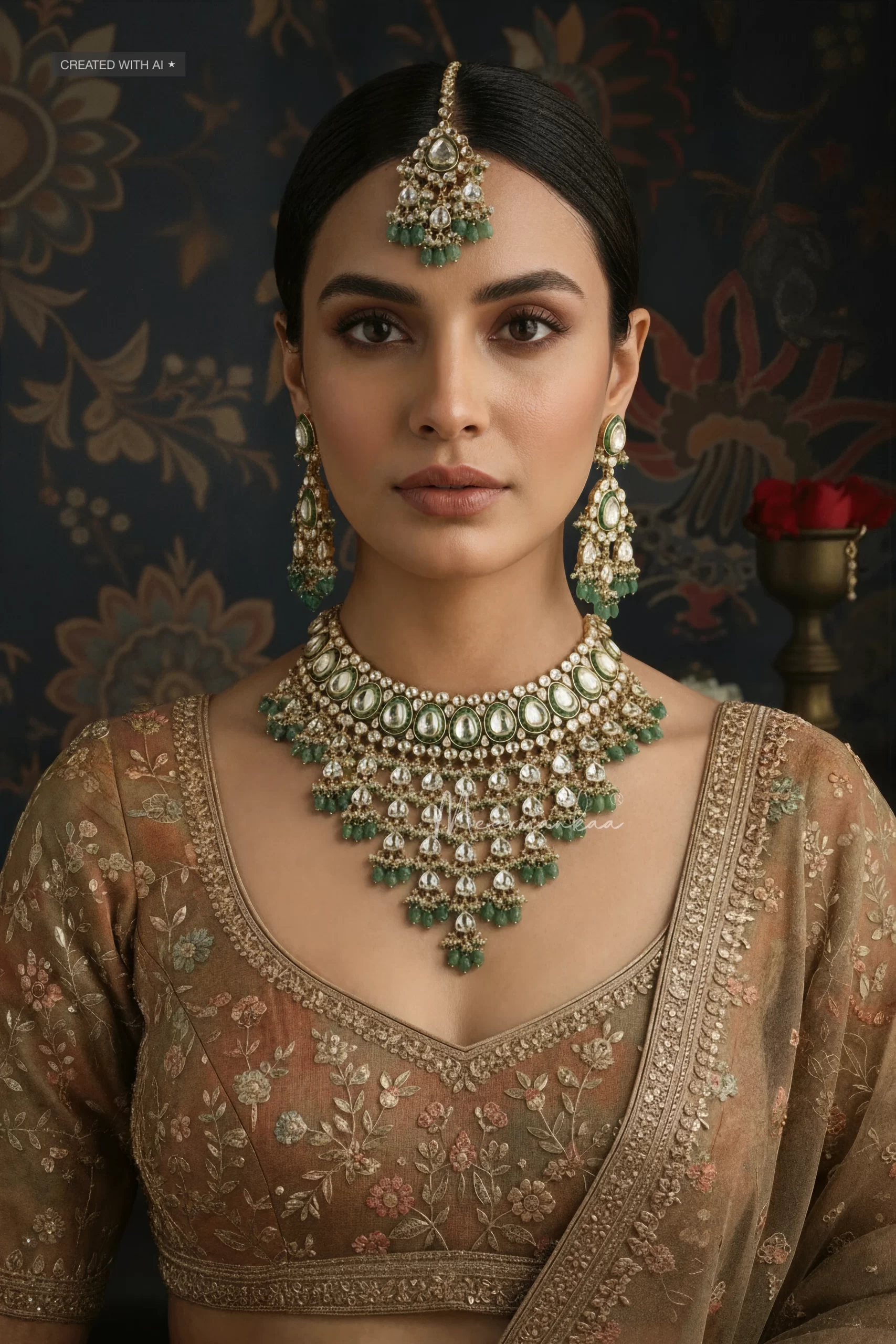 Rows of pear-shaped motifs flow into multi-tiered hangings adorned with pearls and semi-precious green beads, creating a dramatic yet graceful drape around the neckline. The set is complete with elaborate jadau earrings and a matching maangtikka, making it a perfect choice for bridal occasions and festive soirées.
