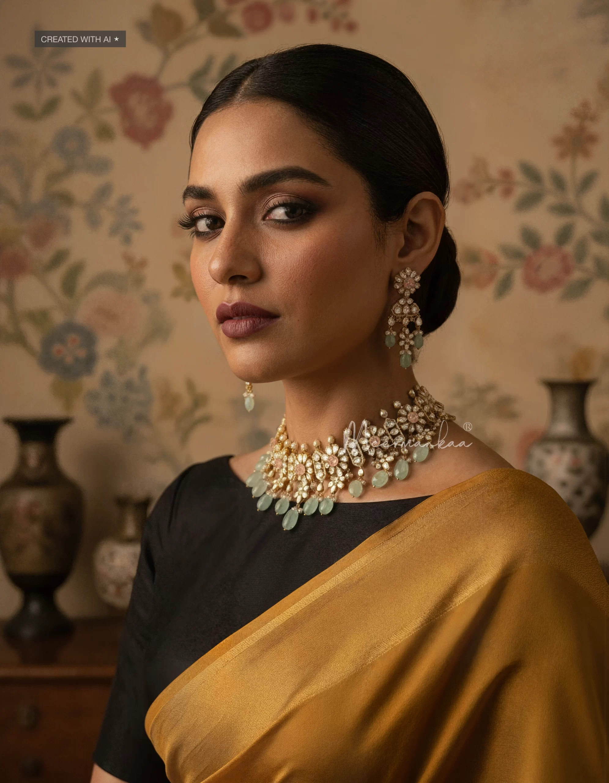 A beautiful floral Sterling Silver Gold plated Necklace Set studded with moissanite polkis, colored stones followed by pastel colored stone drops will add the much needed sparle to your outfit. The set comes with a pair of earrings.