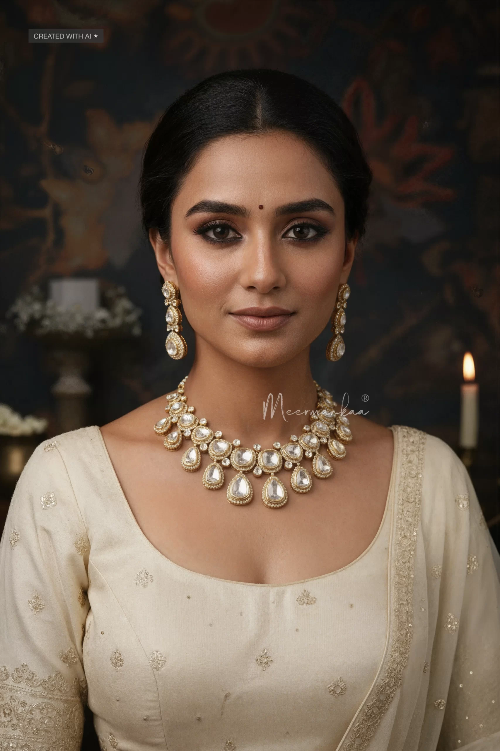 Elegant yet statement, this Sterling Silver Necklace set is studded with Moissanite polkis. Zirconia crystals are added which makes the piece even more gorgeous and intricate,