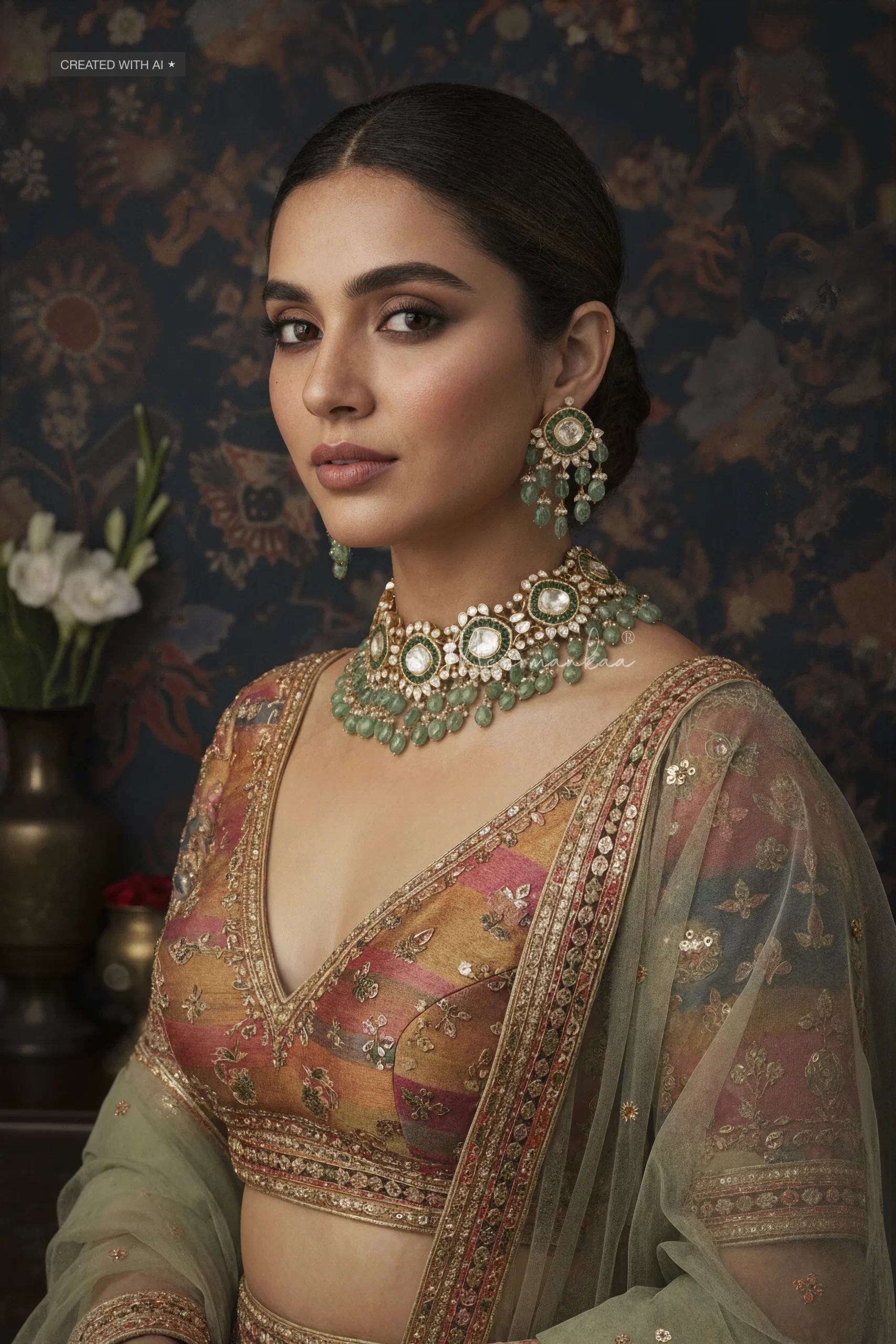 An elaborate Necklace Sets with statement sized moissanite polki with drop earrings